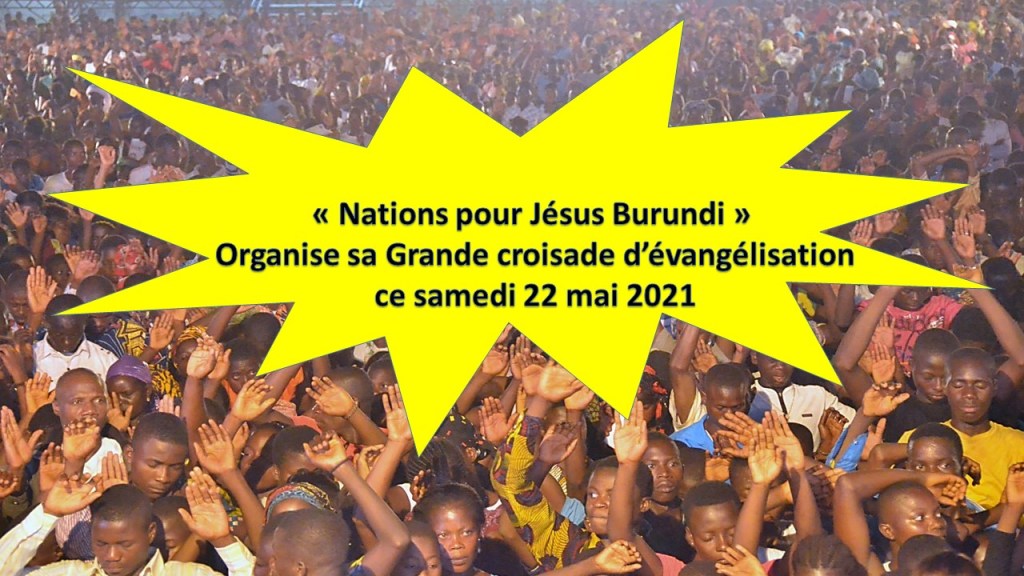 « Nations pour Jésus Burundi » Organise sa grande croisade d’évangélisation ce samedi 22 mai 2021 de 15h à 17h à Bujumbura sur le terrain du Quartier Ruyaga (à côté de l’église Pentecôte ).